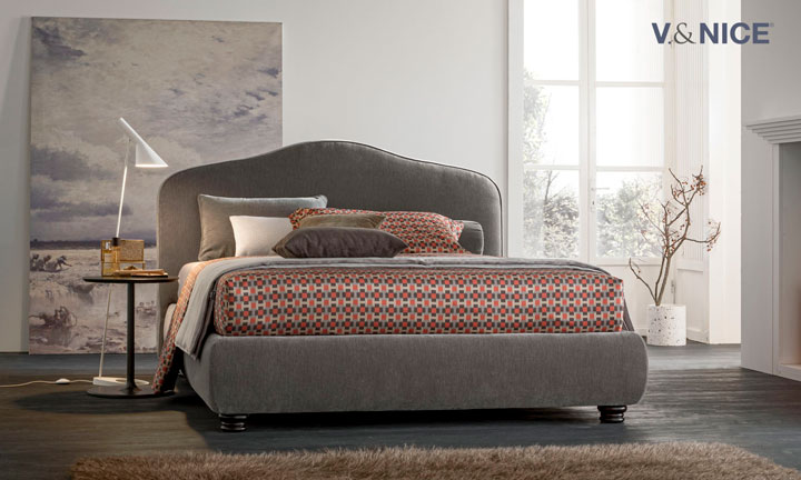 L’ampia testata ha un design curvilineo che riprende le forme bombate del giroletto e dei piedini. Un letto classico che rende eleganti anche camere moderne.
