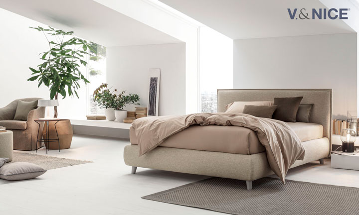 La testiera imbottita di Pascal, come di tutti gli altri modelli di V.&NICE, può essere rivestita con qualsiasi tessuto della vasta gamma proposta dall’azienda.