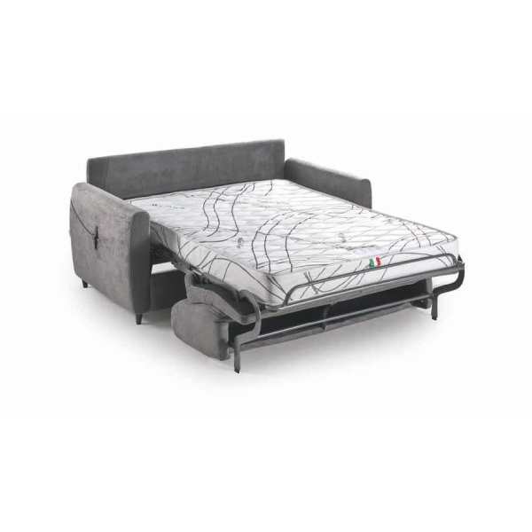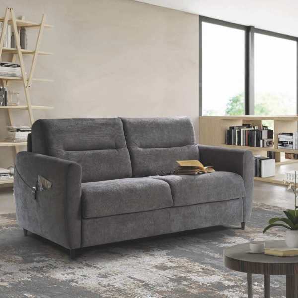 Il divano-letto Roger è un modello dalle linee attuali e vivaci, arricchito dalle impunture sullo schienale e dalle cinghie decorative sui bracci che lo rendono un comodo vano portaoggetti.